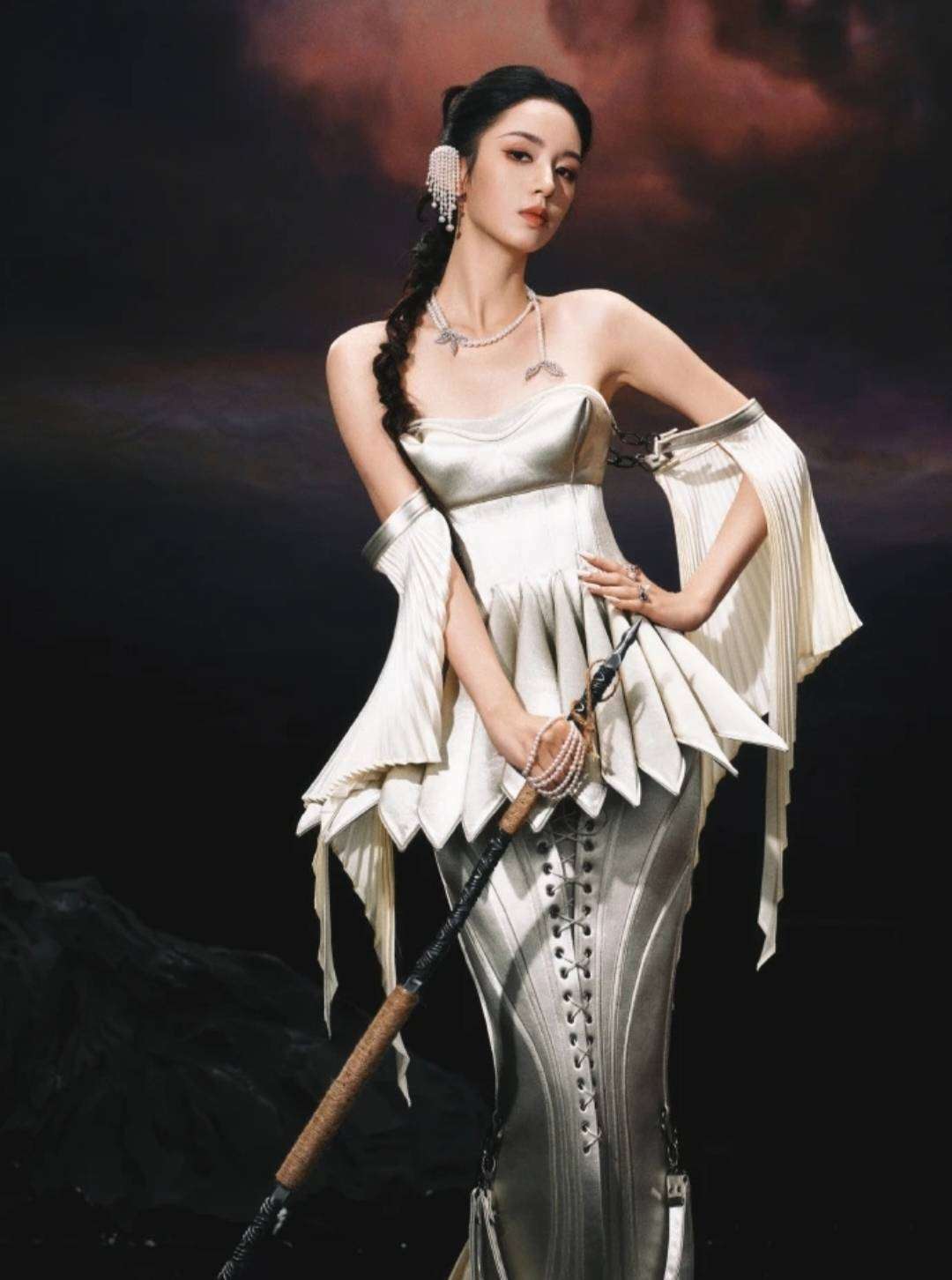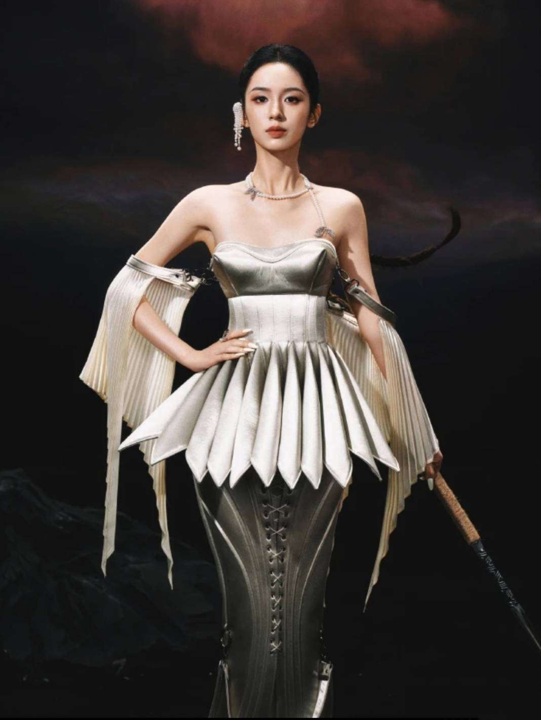 从现场曝光的照片来看,周也的这套女战神造型堪称震撼。她穿着一袭银灰色的金属铠甲式长裙,肩部那夸张的立体剪裁令人联想到古希腊战士的盔甲,而裙摆部分的层叠薄纱又在刚硬中增添了一丝柔美。刚柔并济的设计赋予了她无与伦比的气场,宛如女战神般独立且无畏。而最为吸引眼球的莫过于她腰间的金属腰链,随着她的步伐微微晃动,发出细碎的声响,仿佛是战神出征时铠甲的碰撞声,瞬间拉高了整场的氛围感。有造型师分析指出,这套礼服将未来感的科技元素与古典战神的精神完美融合,单是手工缝制的金属片,就用了整整300片,历时近200小时方才完成。