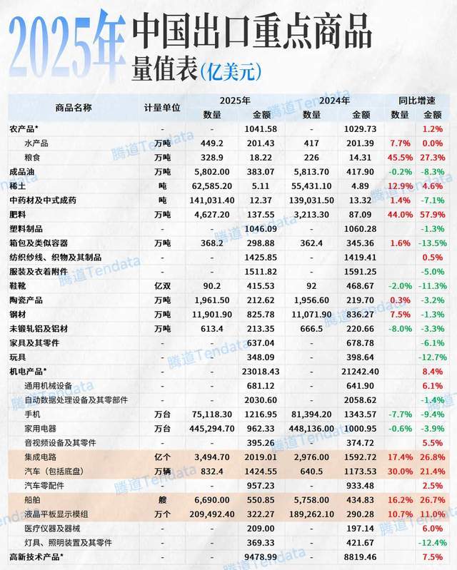 比如“新三样”:新能源汽车、锂电池、太阳能电池,出口1751亿美元;高端制造、AI硬件、出海服务、情绪消费相关品类,普遍增长超20%。